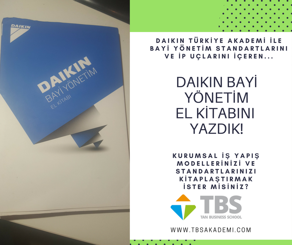 Sonra anladık ki bu modeli sadece eğitimlerle değil , kurumsal bir el kitabı ile de anlatmalıyız. Bu nedenle öncelikle Daikin Bayi Yönetim El Kitabı'nı kalema alarak bir Daikin bayisinin işini nasıl geliştirip, satışını nasıl artıracağını, müşterisini nasıl memnun edeceğini anlatan bir kılavuz oluşturduk. Optimiz yayınları ile birlikte görsel tasarımı yapılan bu kitap Daikin Türkiye Akademi'nin kütüphanesindeki ilk kurumsal kitap olarak özel yerini aldı.